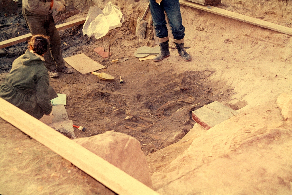 Norsa RAÄ 131, grav 1. Mannens skelett under utgrävning. 1964.
