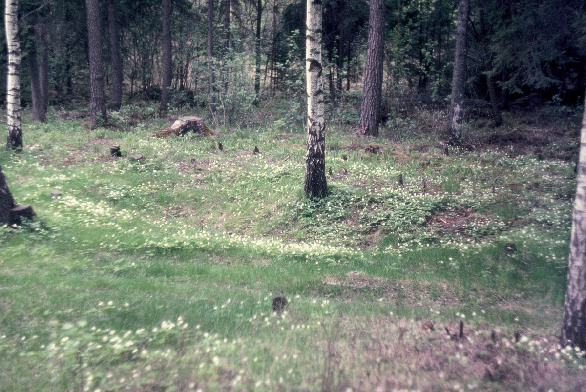 Norsa RAÄ 131, grav 1. Gravfältet på våren med vitsippor och björkar. 1964.