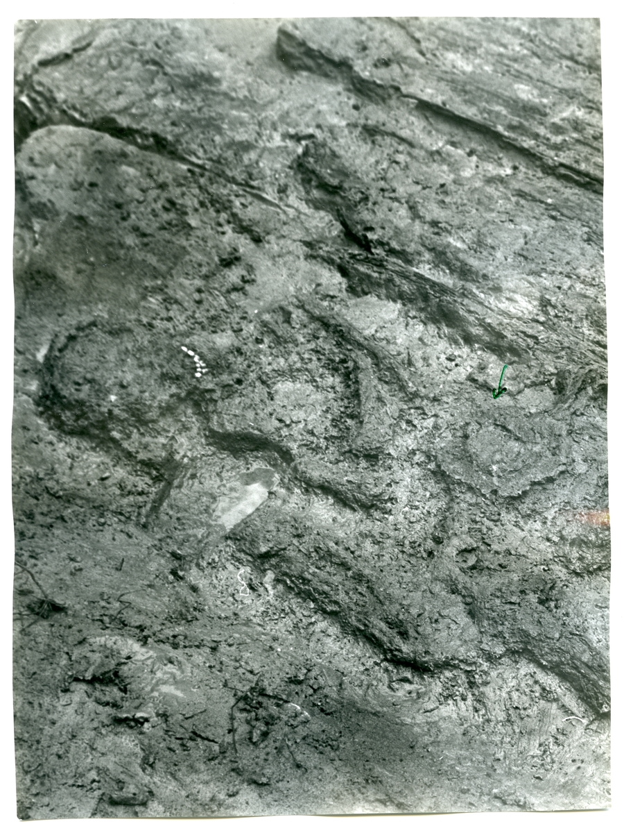Norsa RAÄ 131, grav 1. In situ: Pilar vid skelettet visar sköldbucklan. 1964.