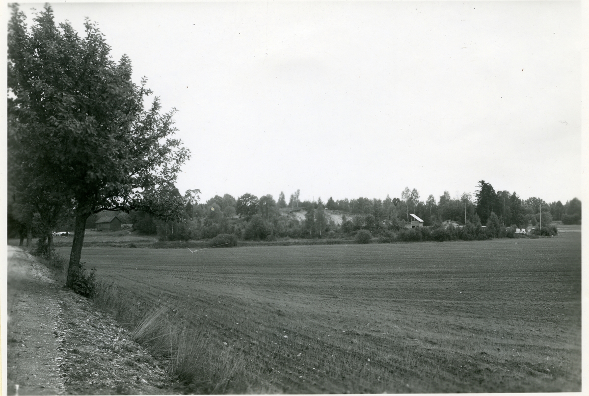 Badelundaåsen 1949. Näs 1:1. Åker i förgrunden med grustag i bakgrunden.