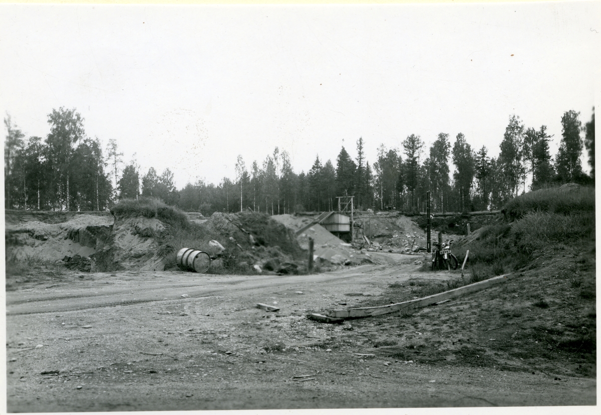 Badelundaåsen 1949. Näs 1:1. Grustag med bl.a. cyklar och tunna.