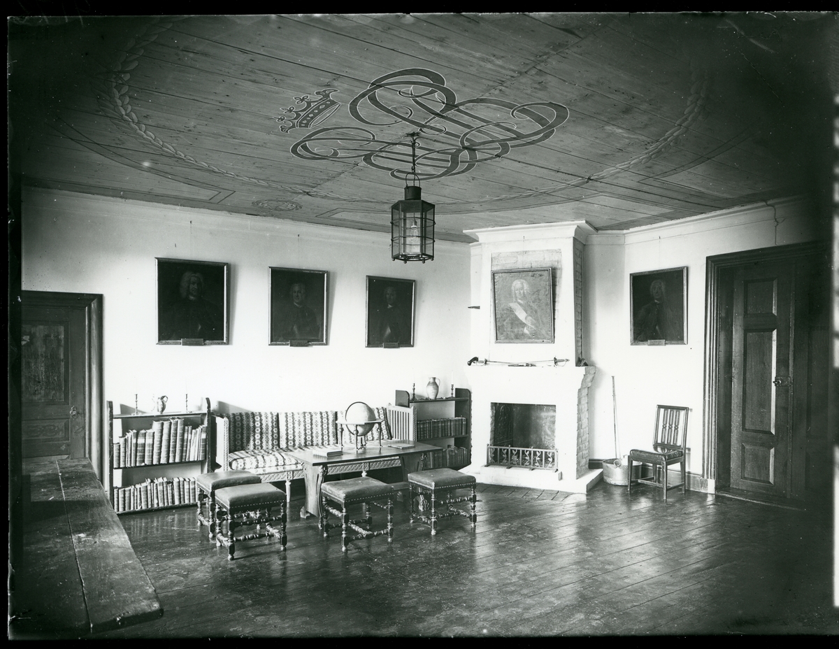 Interiör av sal i Gäddeholms herrgård. Med Öppen spis, soffa, bokhyllor, jordglob, porträttmålningar m.m.