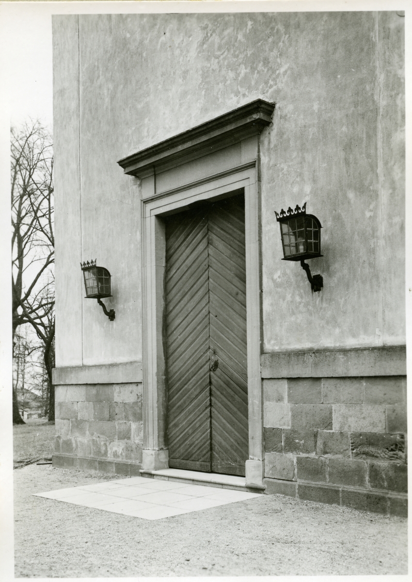 Exteriör av Kung Karls kyrka, dörr och vägglampor.