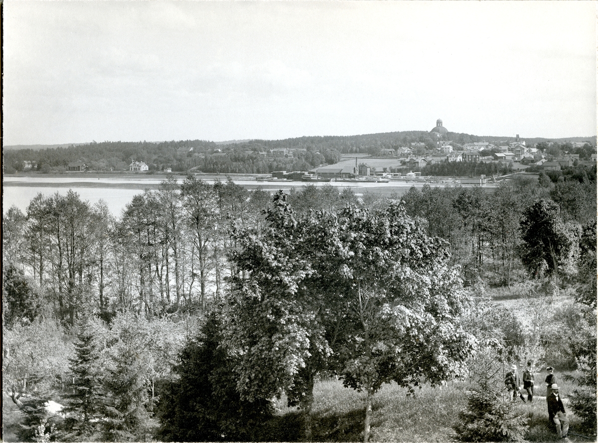 Tre män och en kvinna i landskap med Kungsör i bakgrunden, på andra sidan ån.
