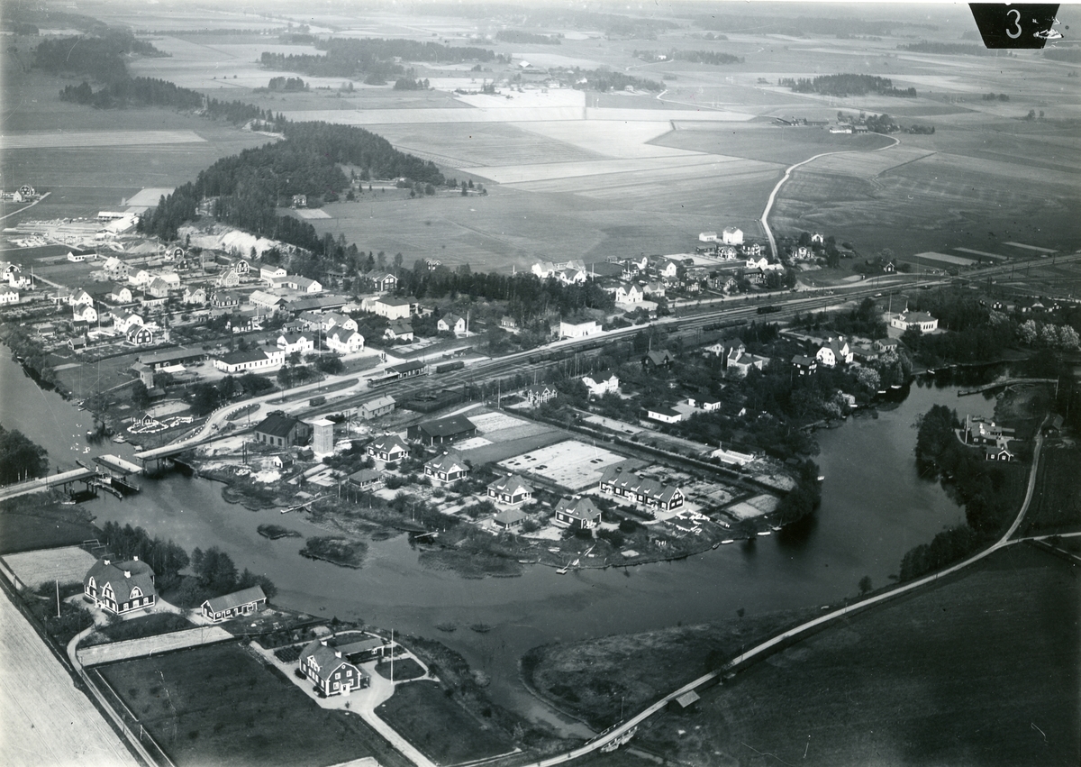 Flygfoto över Kolbäcks samhälle, ån, väg och åkrar m.m.