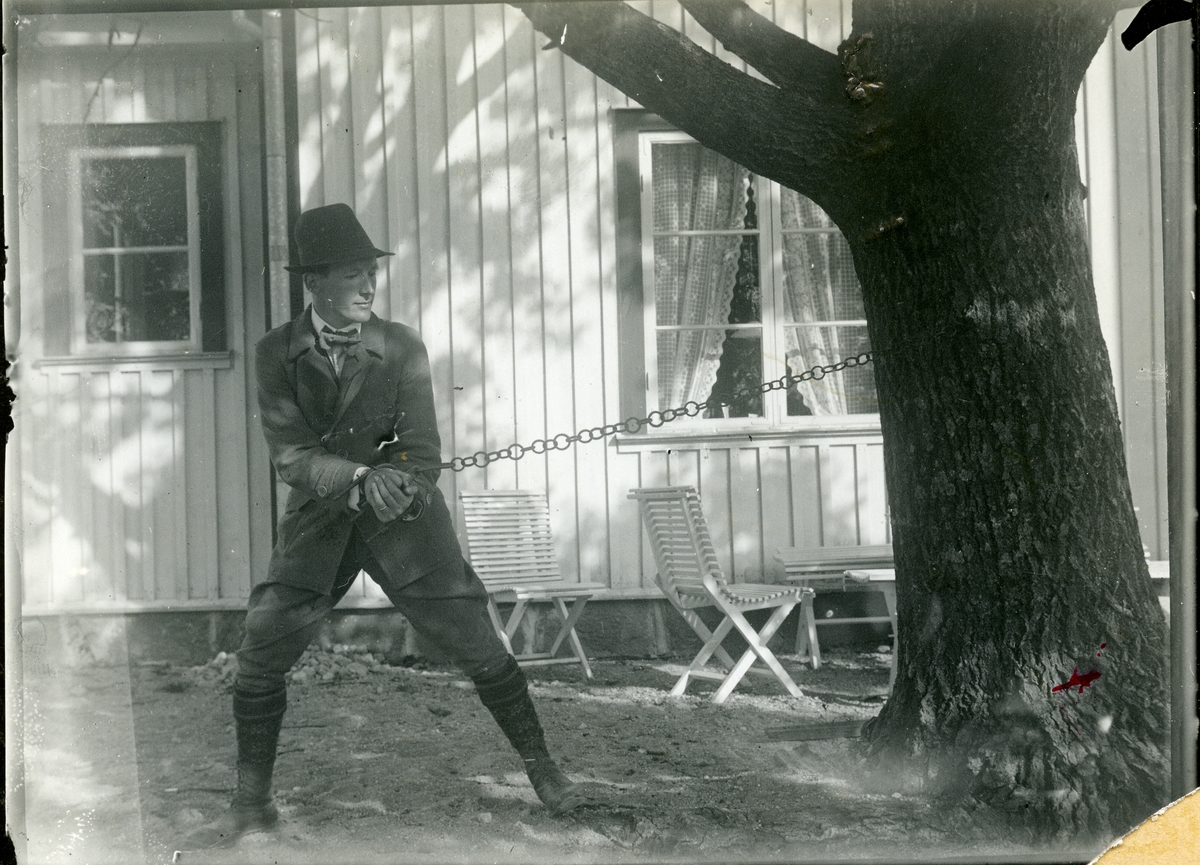 Man står kedjad vid träd och drar i kedjan.