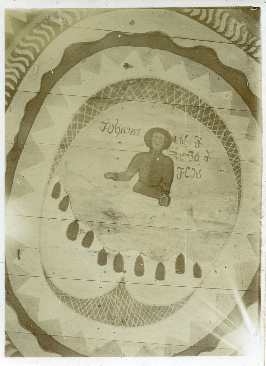 Titel: Karbenning sn, Bennebo by. Målning i förstugutaket till Anders Pers' gården, föreställande aposteln Johannes.
