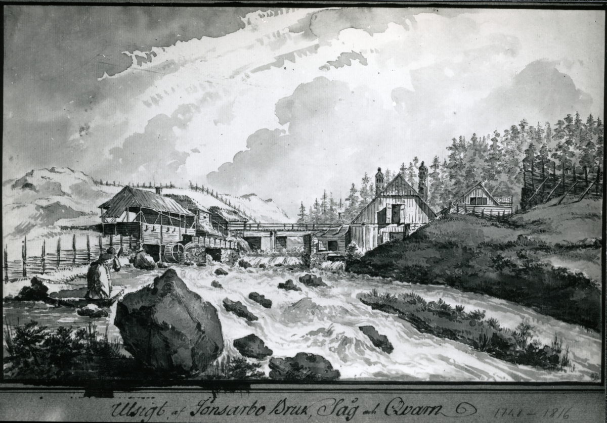 Teckning föreställande Jönsarbo bruk, såg och kvarn.