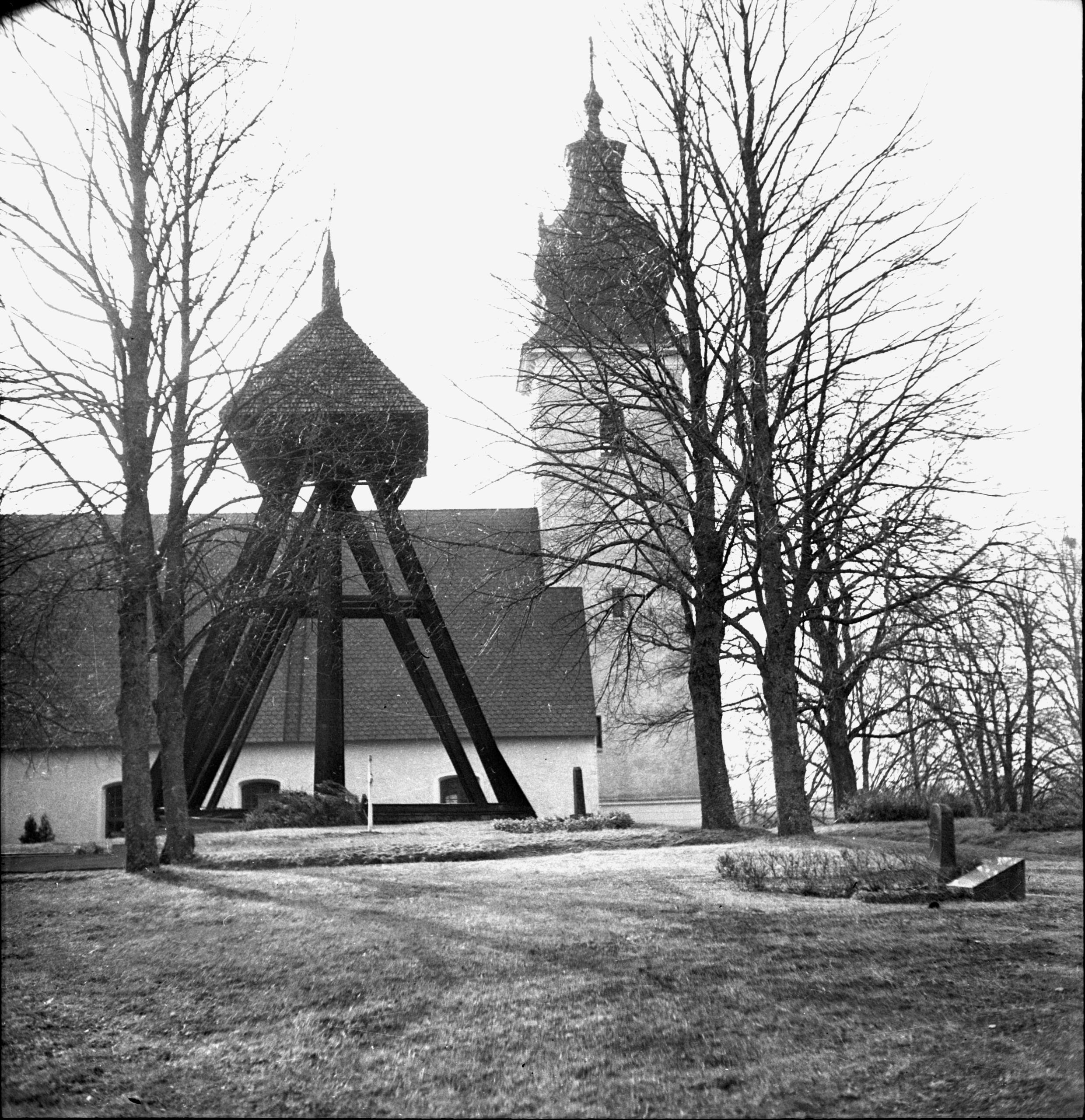 Kyrkan mot söder med klockstapeln i förgrunden.