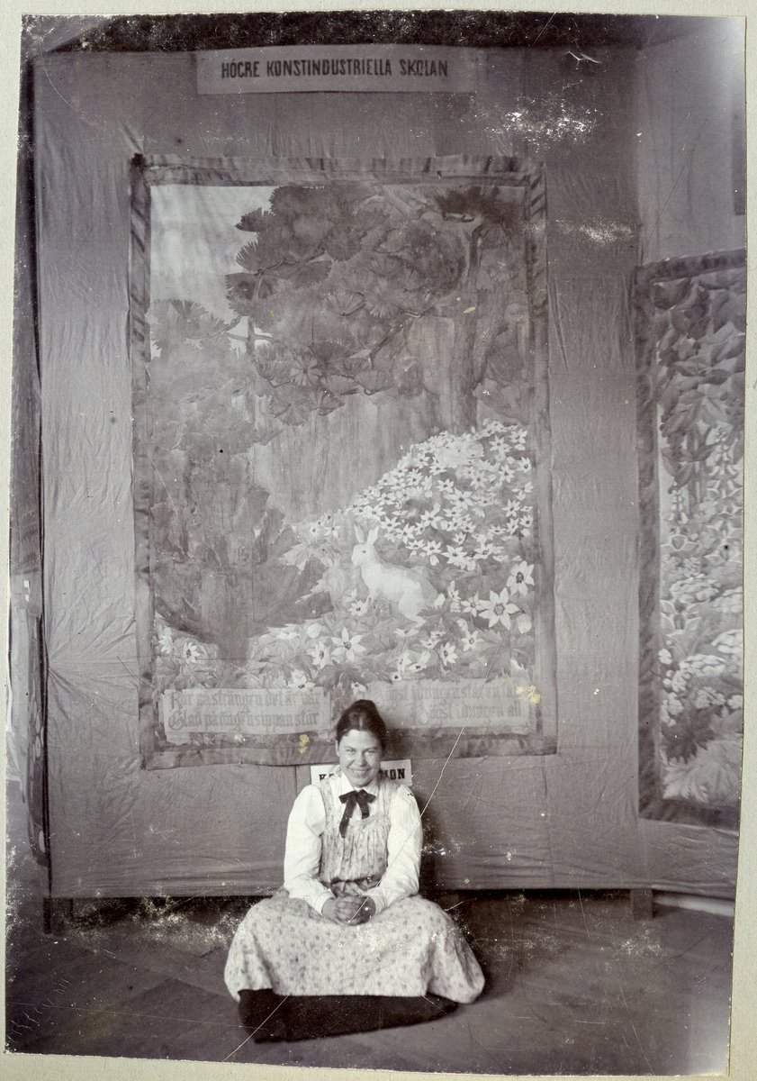 Kvinna sitter framför tavla med hare och blommor. 1901.