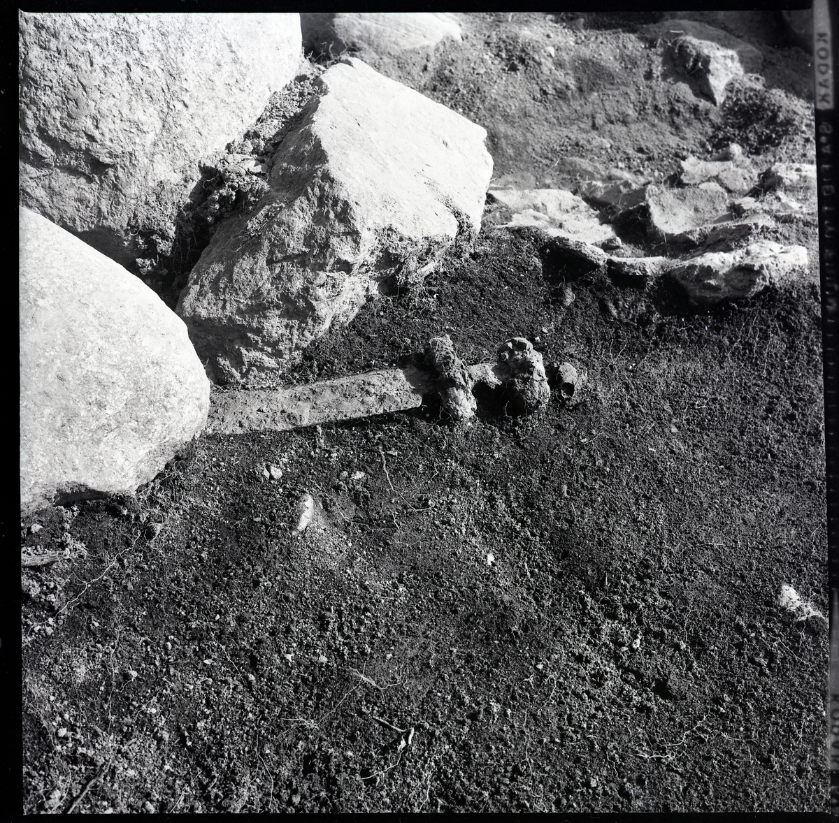 "Hummelbacken". Utgrävning av gravfält RAÄ 117, anläggning 9, svärd. 1961.