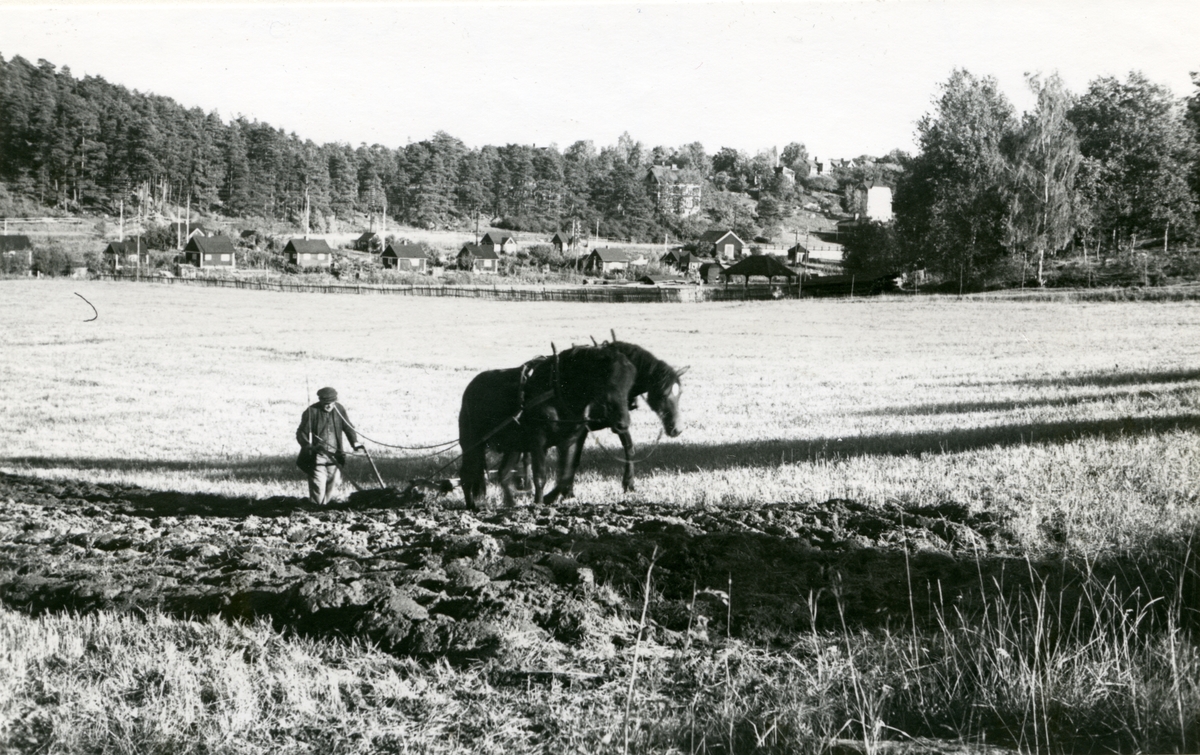 Bonde plöjer med häst framför plogen. 1933.