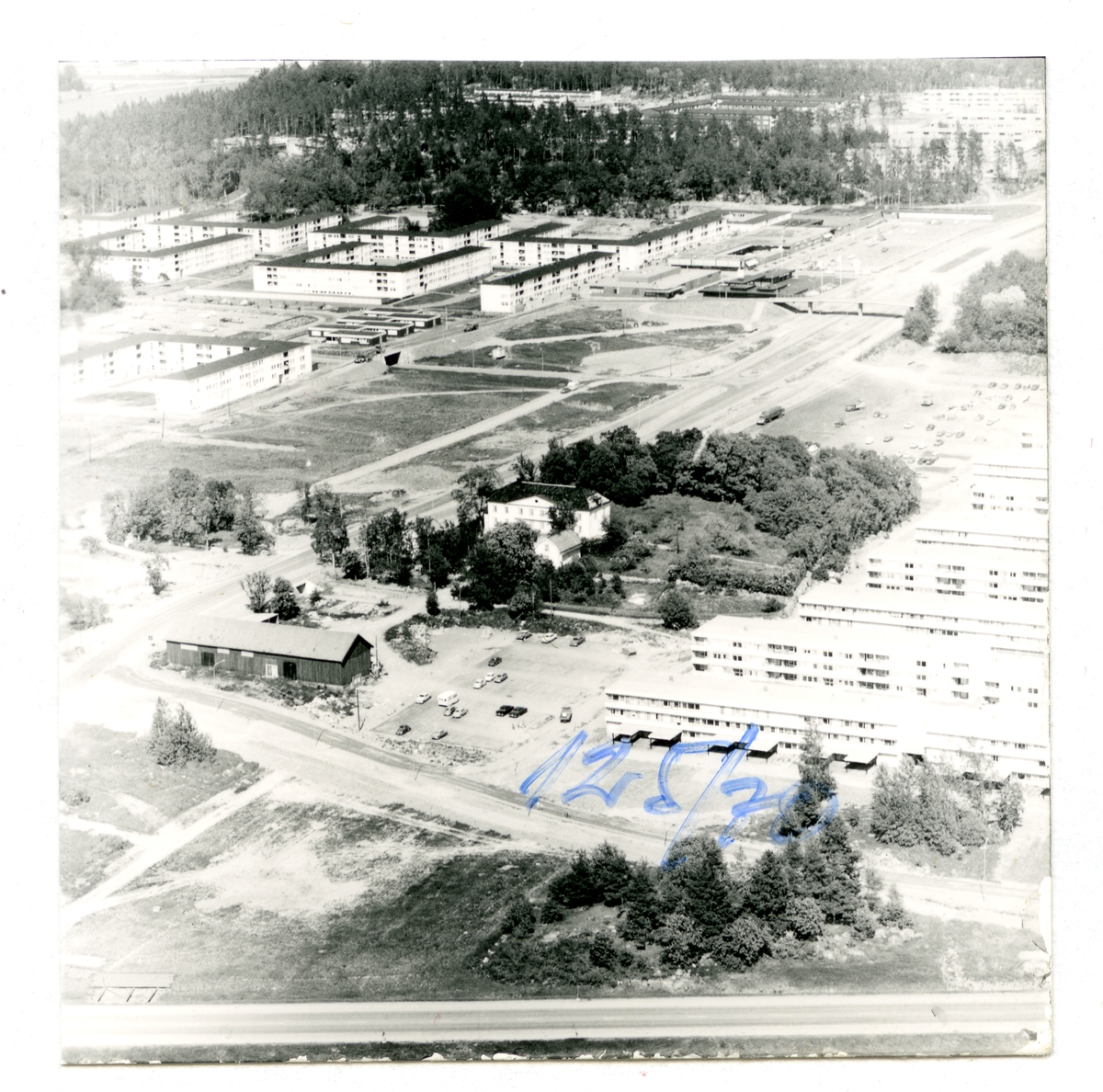 Med lada i förgrunden och bostadsområden på båda sidor.