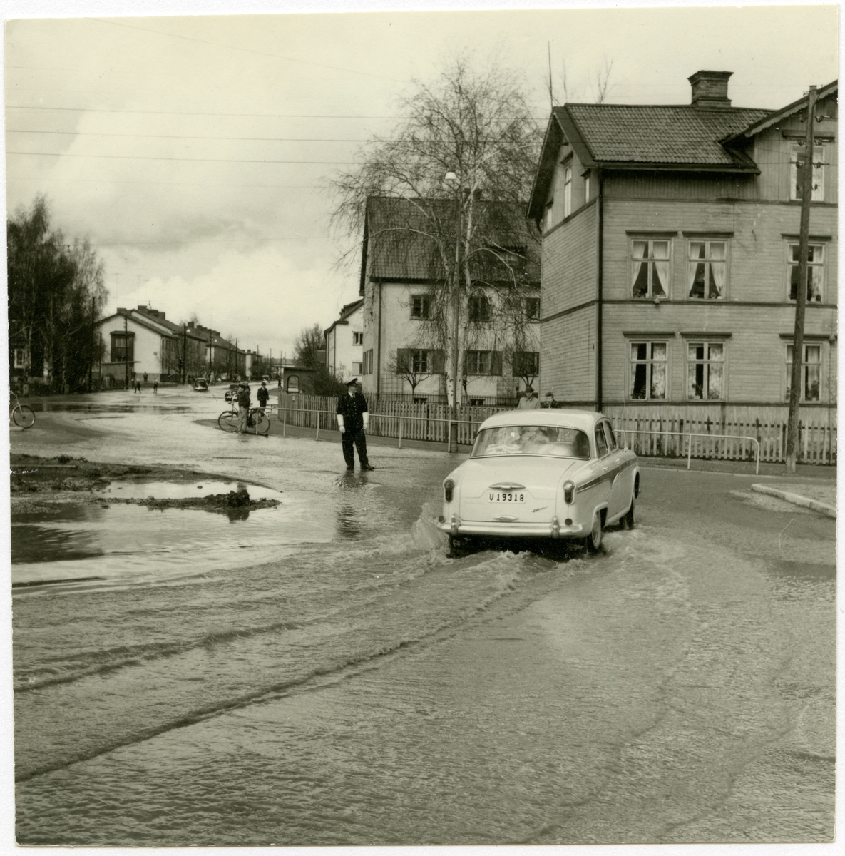 Korsningen Vasagatan (rakt fram) - Norra Ringvägen i Västerås, (Gåsmyrevreten). Trafikpolis står på vägen. 1960-tal.