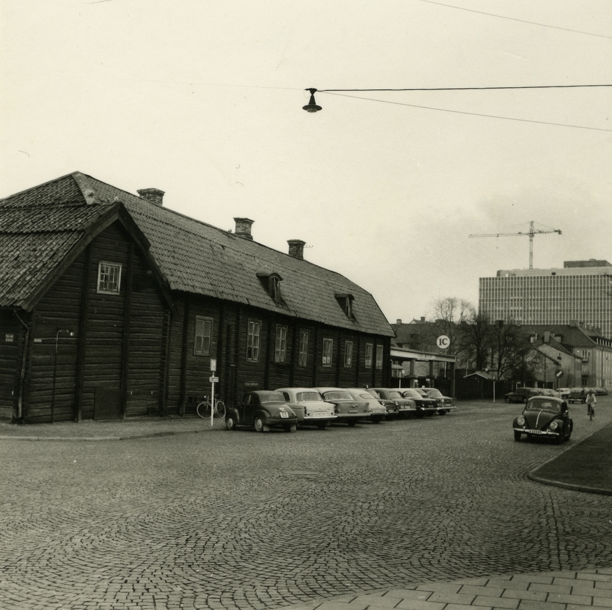 Västerås. Munkgatan med Bomanska gården och IC bensinstation. 1959.