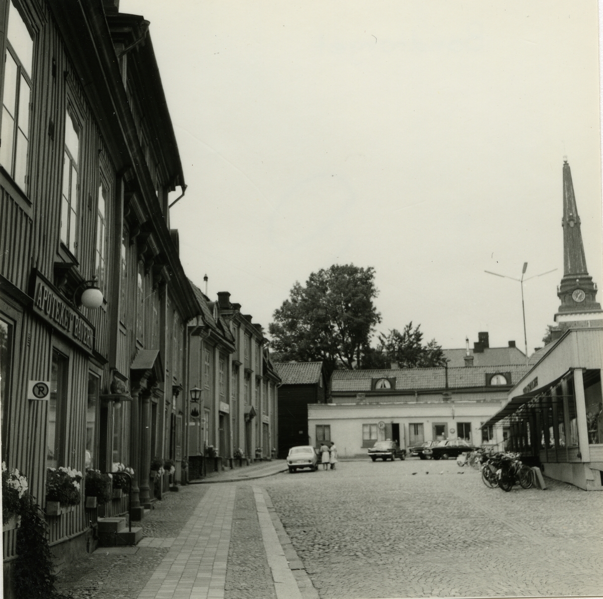 Västerås. Bondtorget mot norr, med apoteket Bävern, domkyrktorn m.m. 1964.