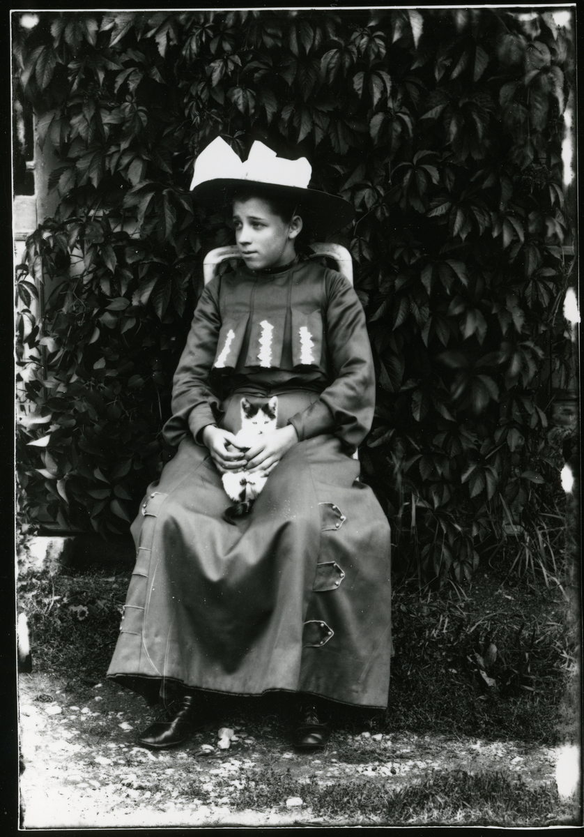 Flicka med stor hatt, sittande med kattunge i knät. C:a 1900.