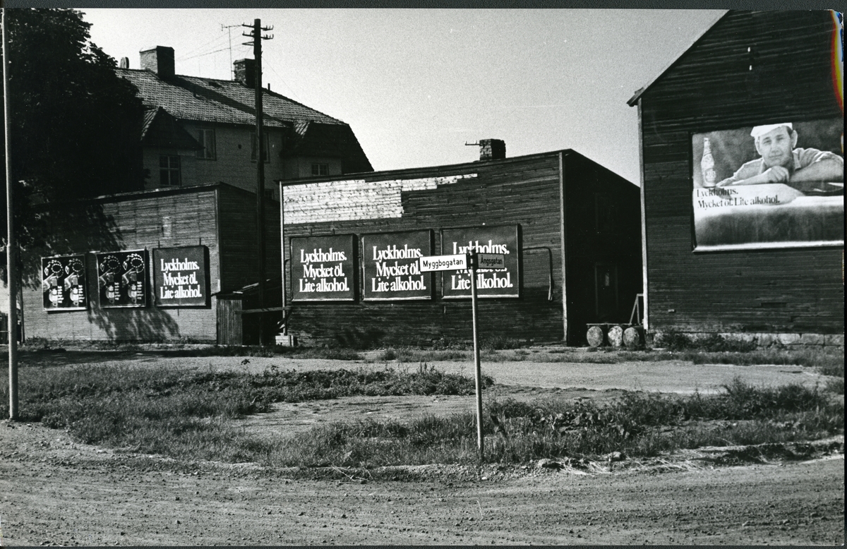Reklam för Lyckholms på husväggar vid korsningen Myggbogatan-Ängsgatan. 1969.