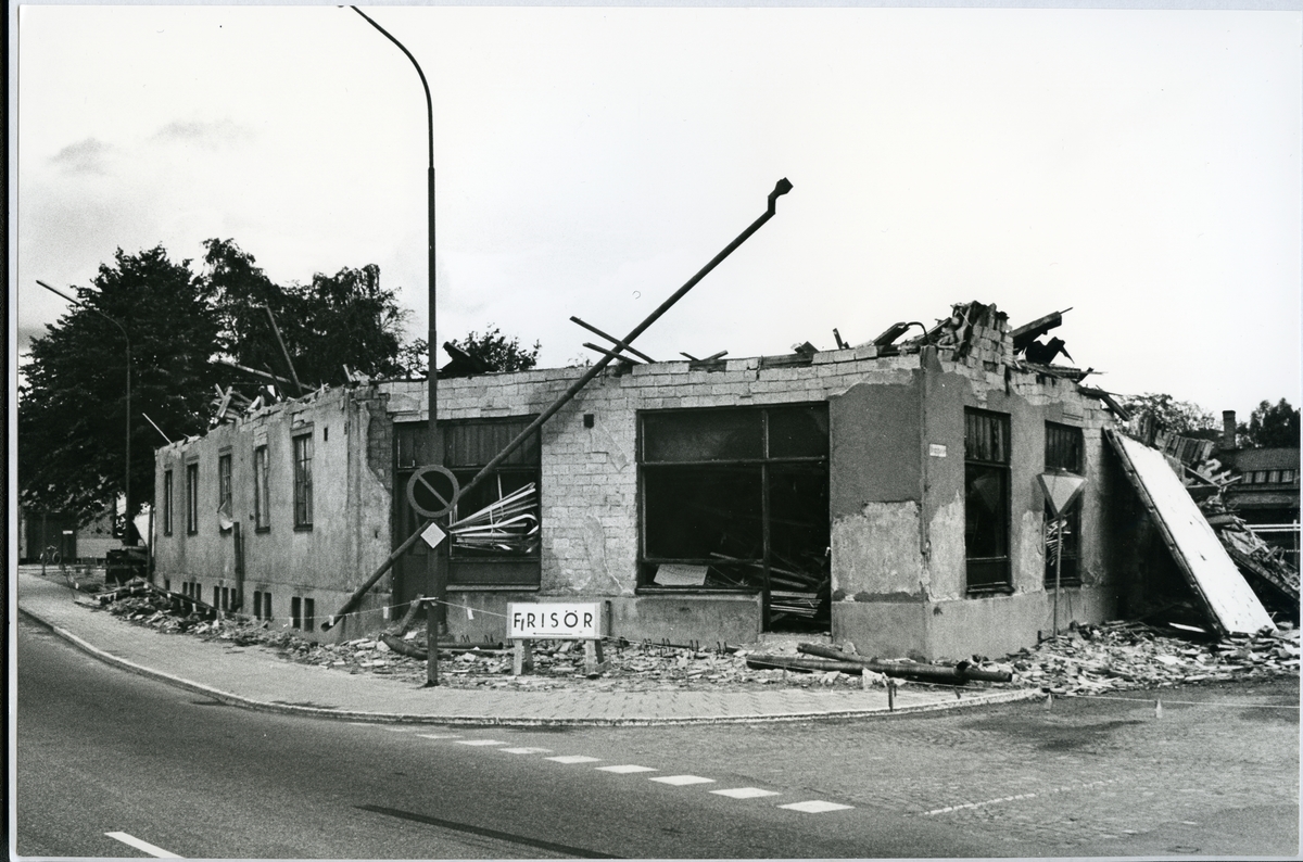 Halvt riven byggnad i hörnet Malmabergsgatan-Ängsgatan, c:a 1969.