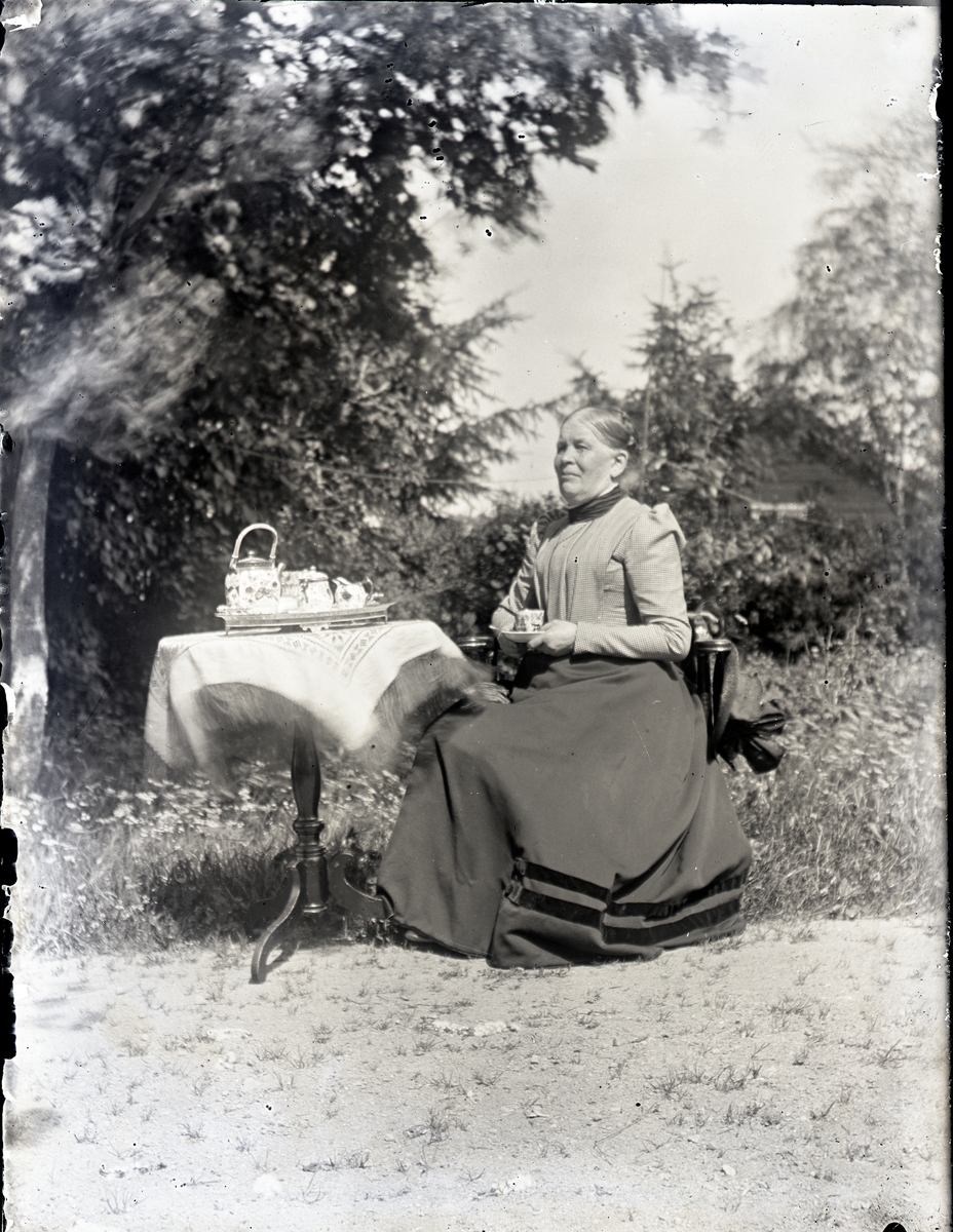 Emma Dybeck vid dukat kaffebord, Lillhärad.