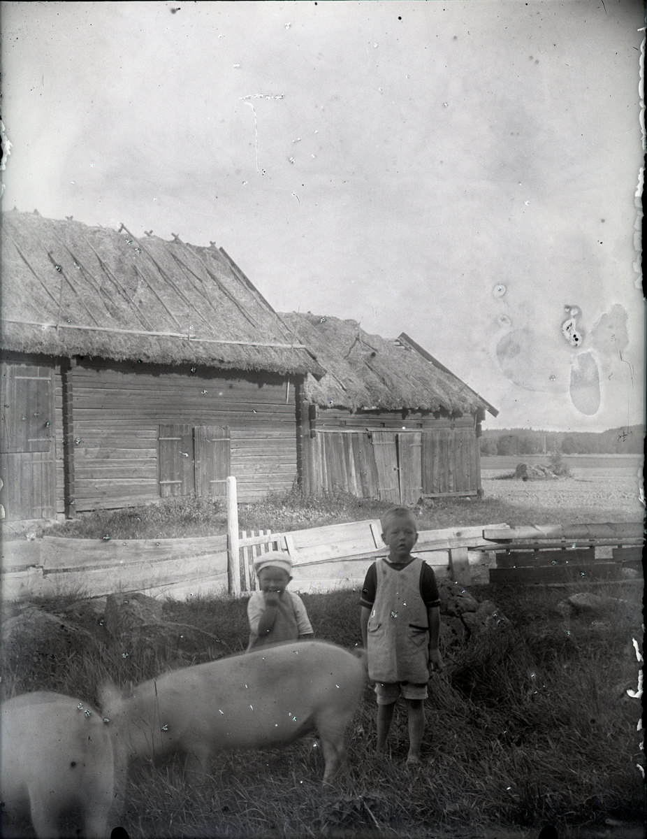Wikmans två barn inne hos grisarna, Lillhärad.