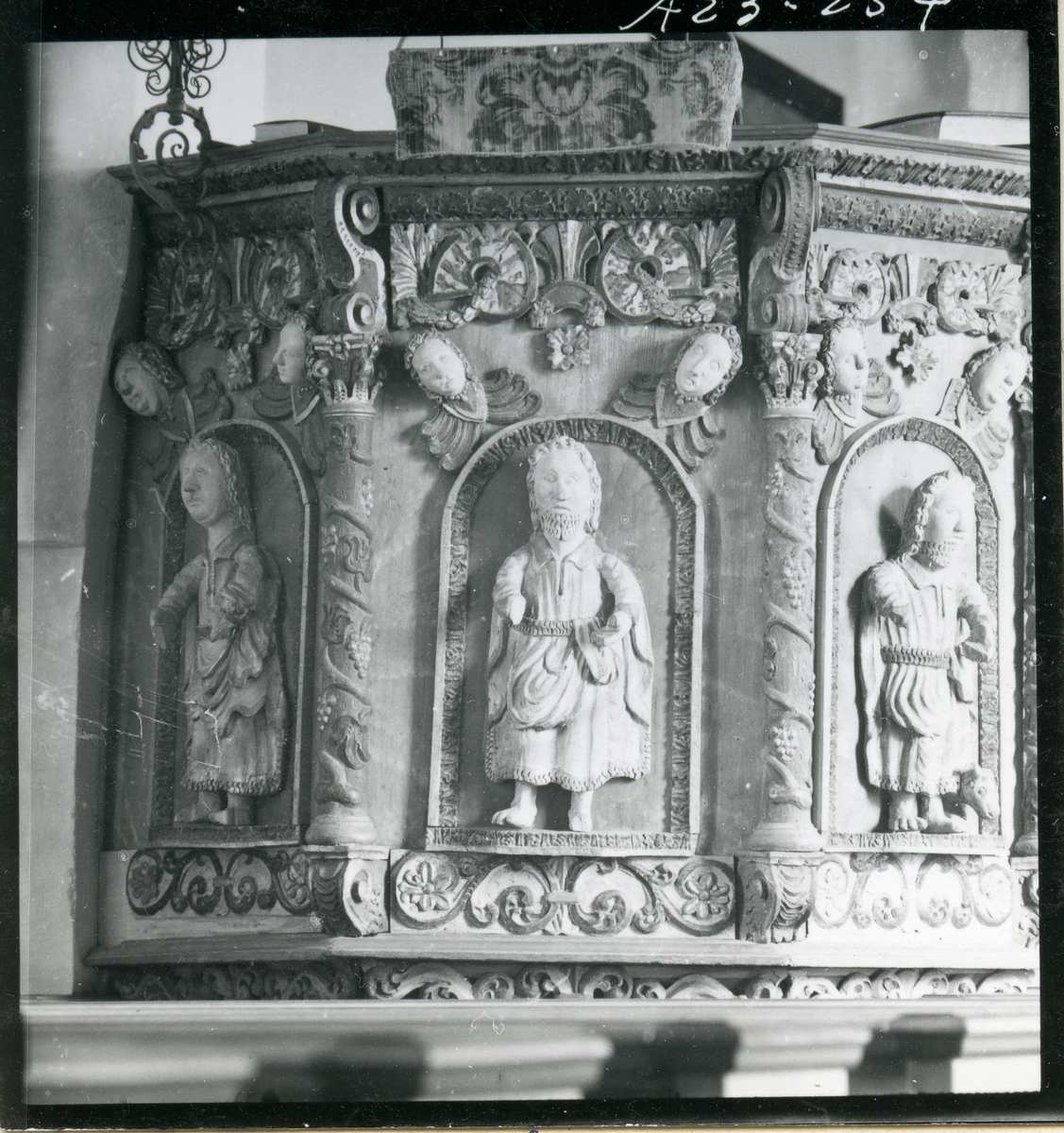 Interiör av Säterbo kyrka, detalj av predikstolen, 1946-1947.