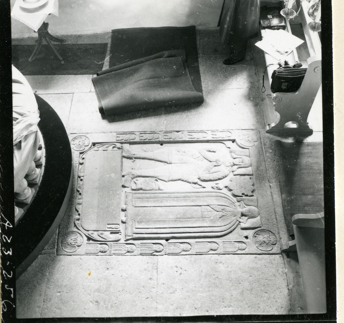 Titel: Säterbo sn, Arboga kn, Säterbo kyrka. Interiör med gravhäll, 1946-1947.