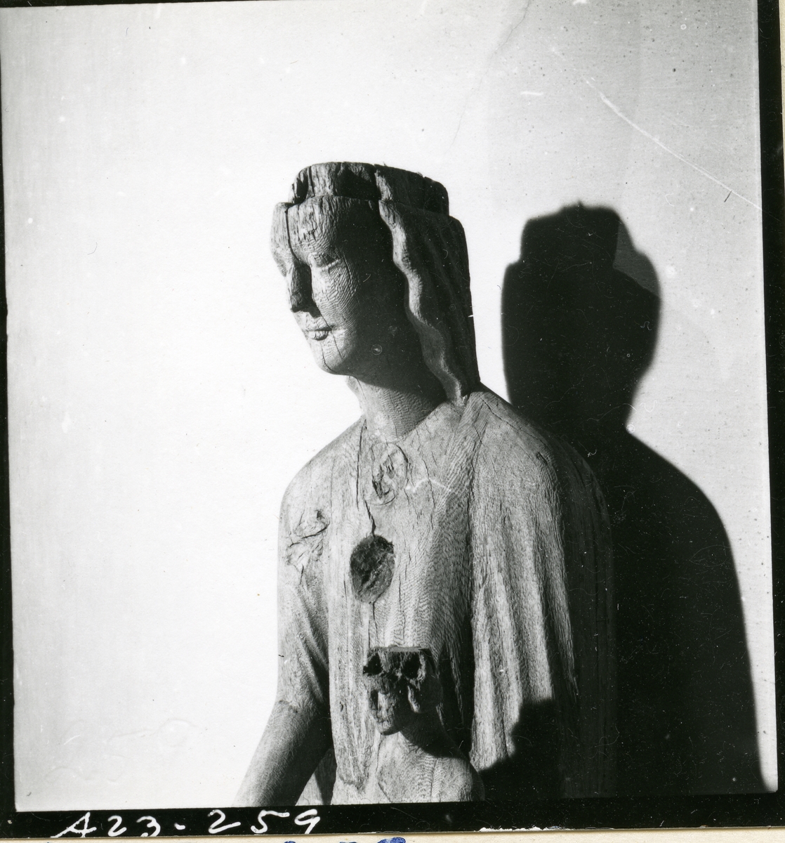 Detalj av träskulptur föreställande Maria med Jesusbarnet, 1946-1947.