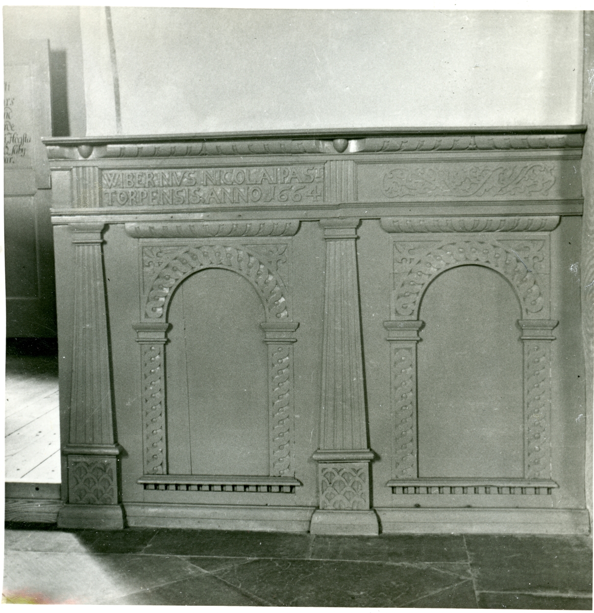 Detalj av kyrkbänk i Torpa kyrka, 1947.