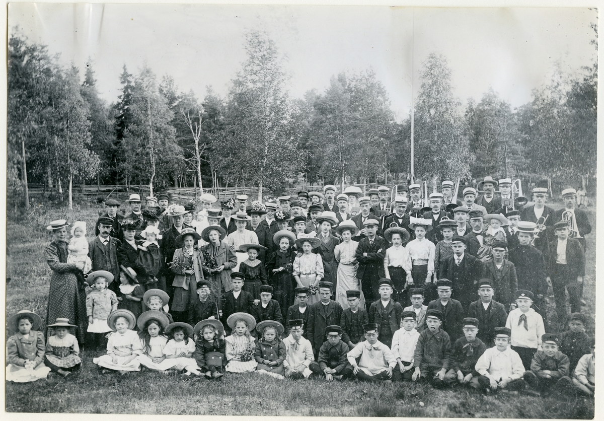 Godtemplare med musikkår på gökotta strax bakom "nuvarande" idrottsplatsen i Surahammar, 1909.