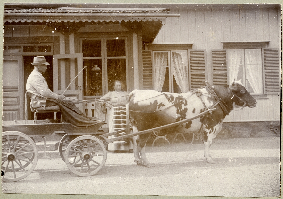 Kusk på oxkärra framför herrgårdsbyggnad, c:a 1900.