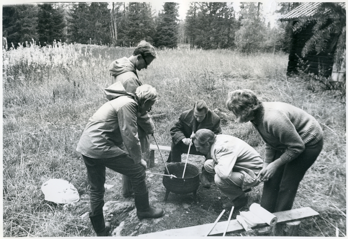 Några personer runt en gryta vid Borgens fäbodvall, 1970.