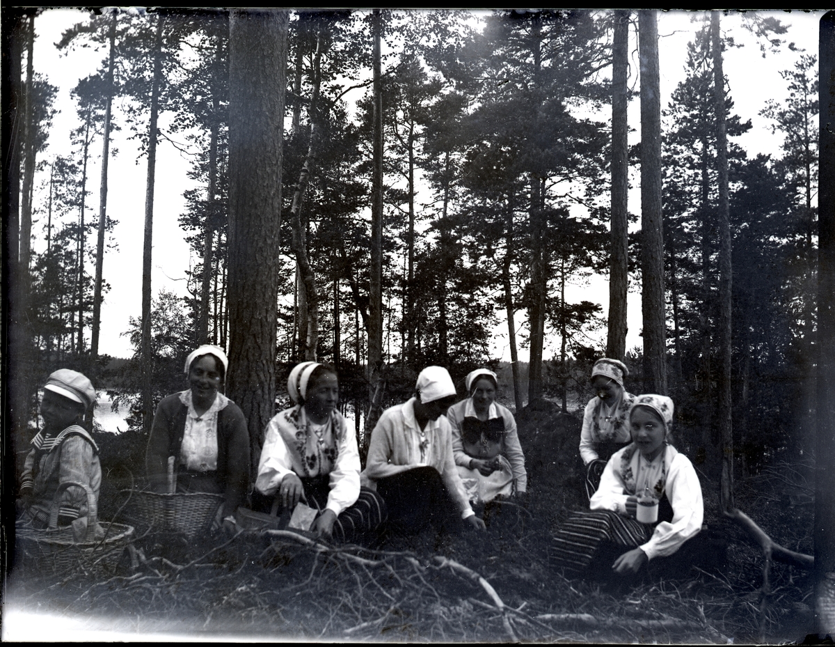 Kvinnor pojke och flicka i nationaldräkter fikar i i skogen.