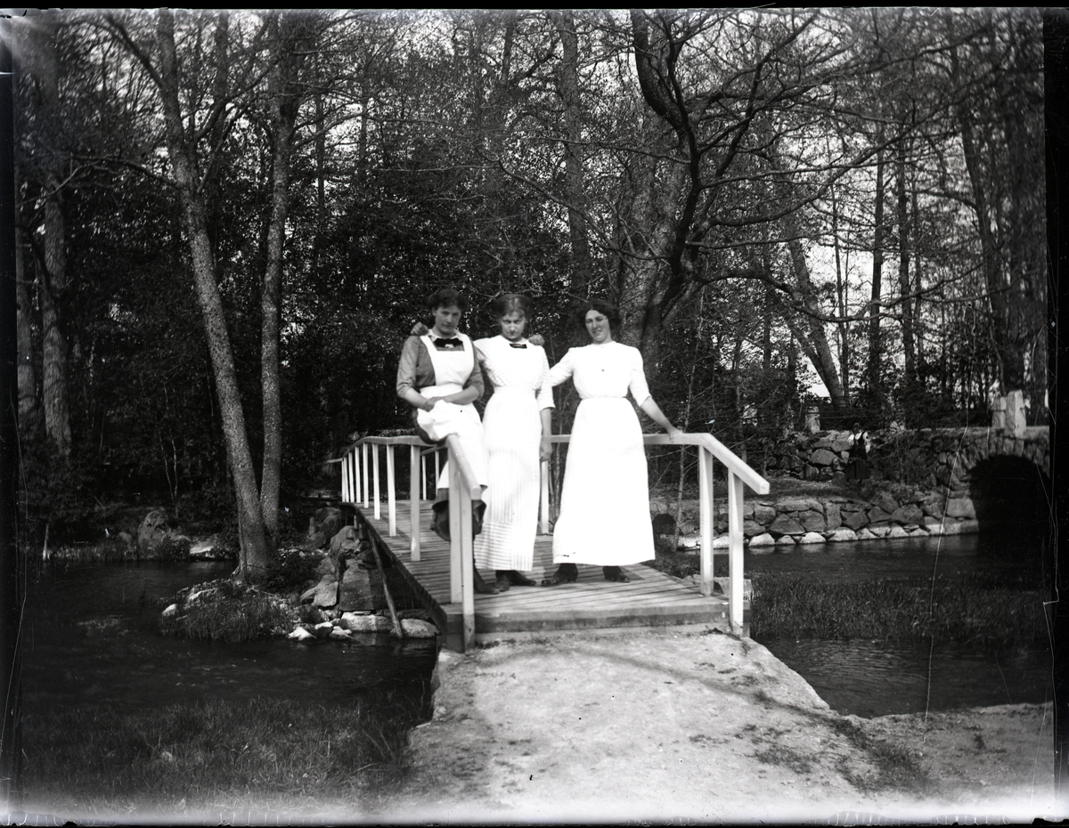 Tre kvinnor på träbro.