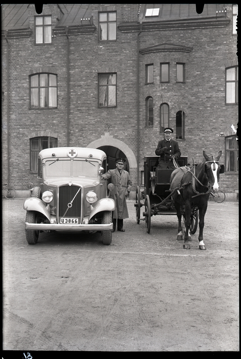 Ambulans och epedemivagn utanför polishuset/brandstationen. 1937.