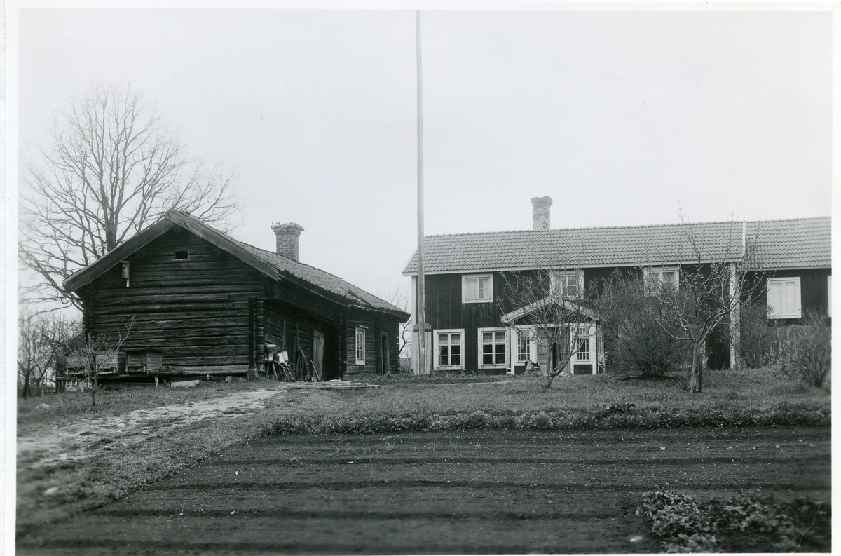 Mangårdsbyggnad och gårdsbyggnad med bikupor vid gaveln.