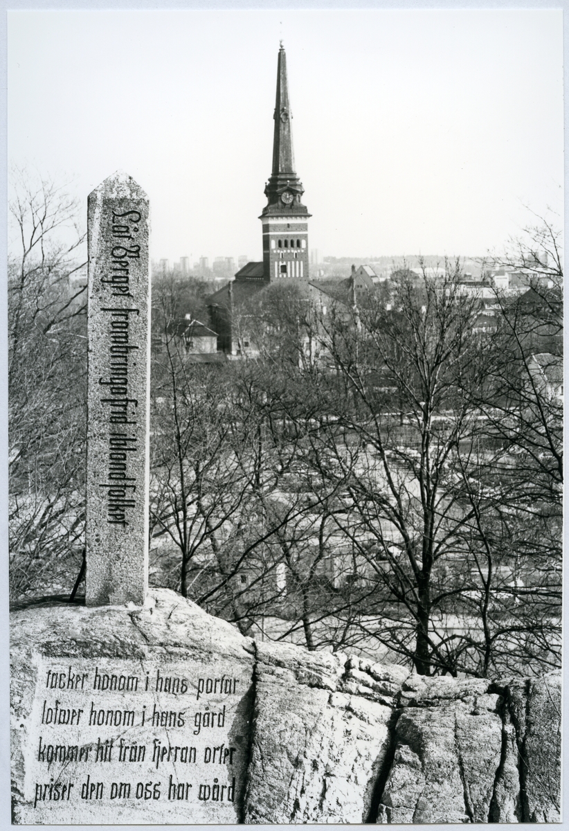 Vy mot Domkyrkan, med minnessten i förgrunden. 1979.