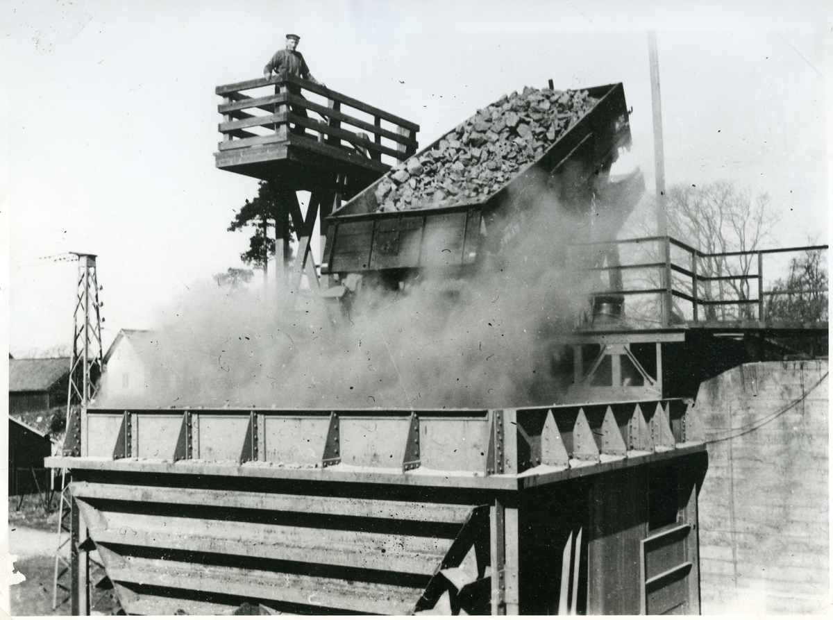 Kalle Grandin tippar malm från malmbryggan, 1937.