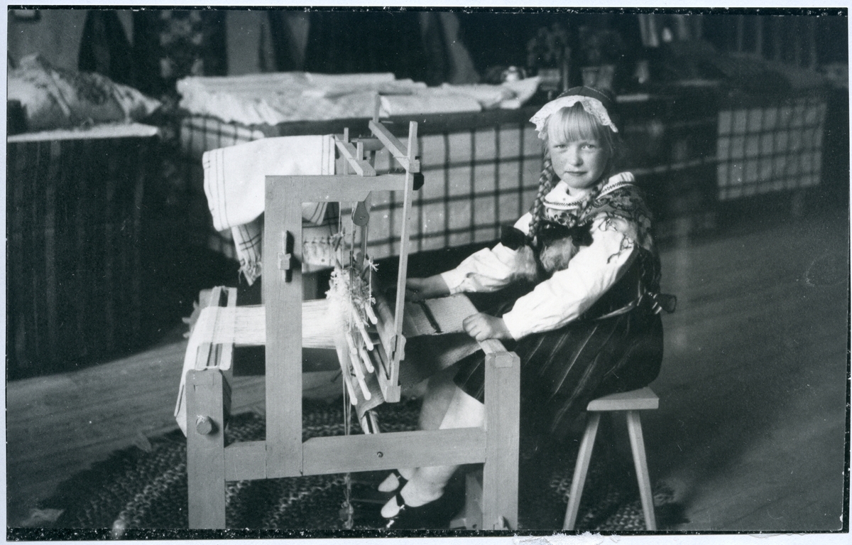 Västeråsutställningen 1929. Okänd flicka vid vävstolen.