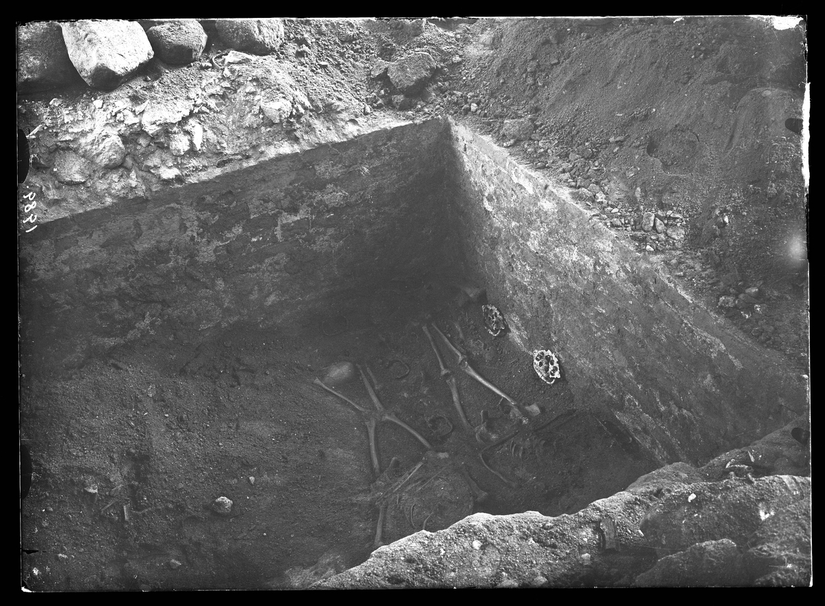 Lundby kyrka, Västerås. Utgrävning, murad grav med skelett.