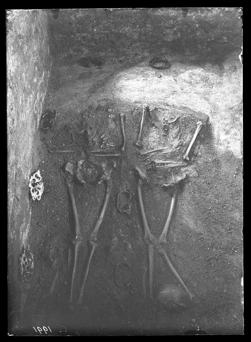 Lundby kyrka, Västerås. Utgrävning, murad grav med skelett.