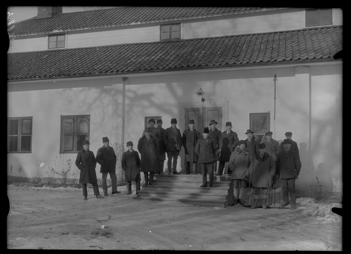 Anbudsgivare samlade på trappen till Hallstahammars herrgård i Hallstahammar.