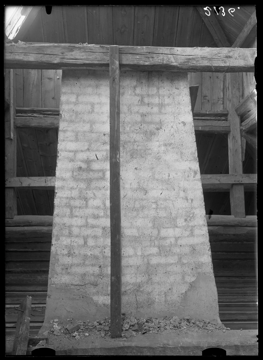 Titel: Skorstensmur på Hallstahammars herrgård, Hallstahammar. Före flytten till Vallby friluftsmuseum, Västerås.