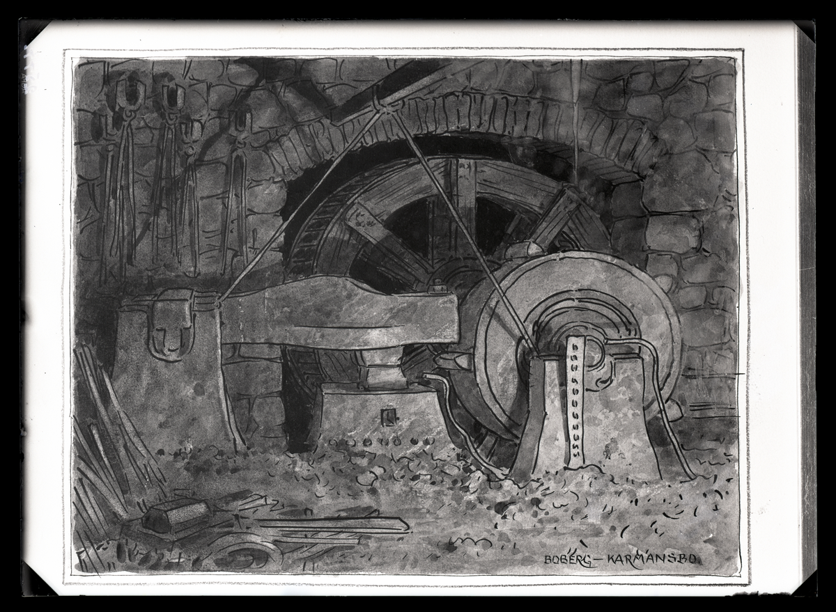 Akvarell av Ferdinand Boberg. Smälthammaren, bruket i Karmansbo, Hed, Västmanland.