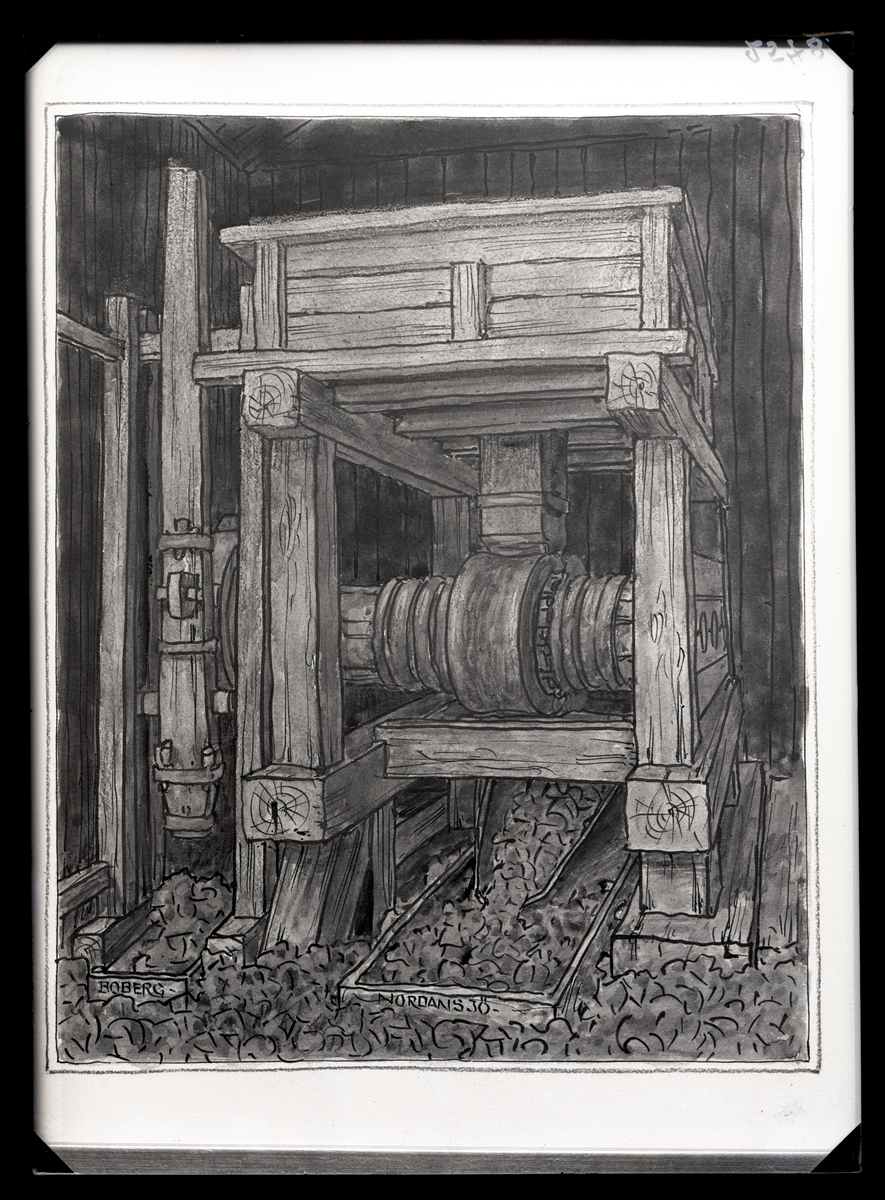 Akvarell av Ferdinand Boberg. Stampverk och malmkross, Nordansjö, Norberg, Västmanland.