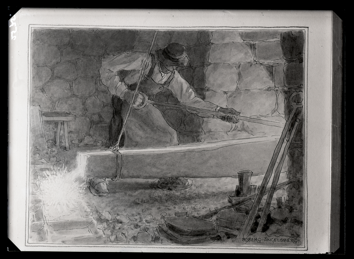 Akvarell av Ferdinand Boberg. Hyttarbetan vid utslaget, Ängelsberg, Västervåla, Västmanland.