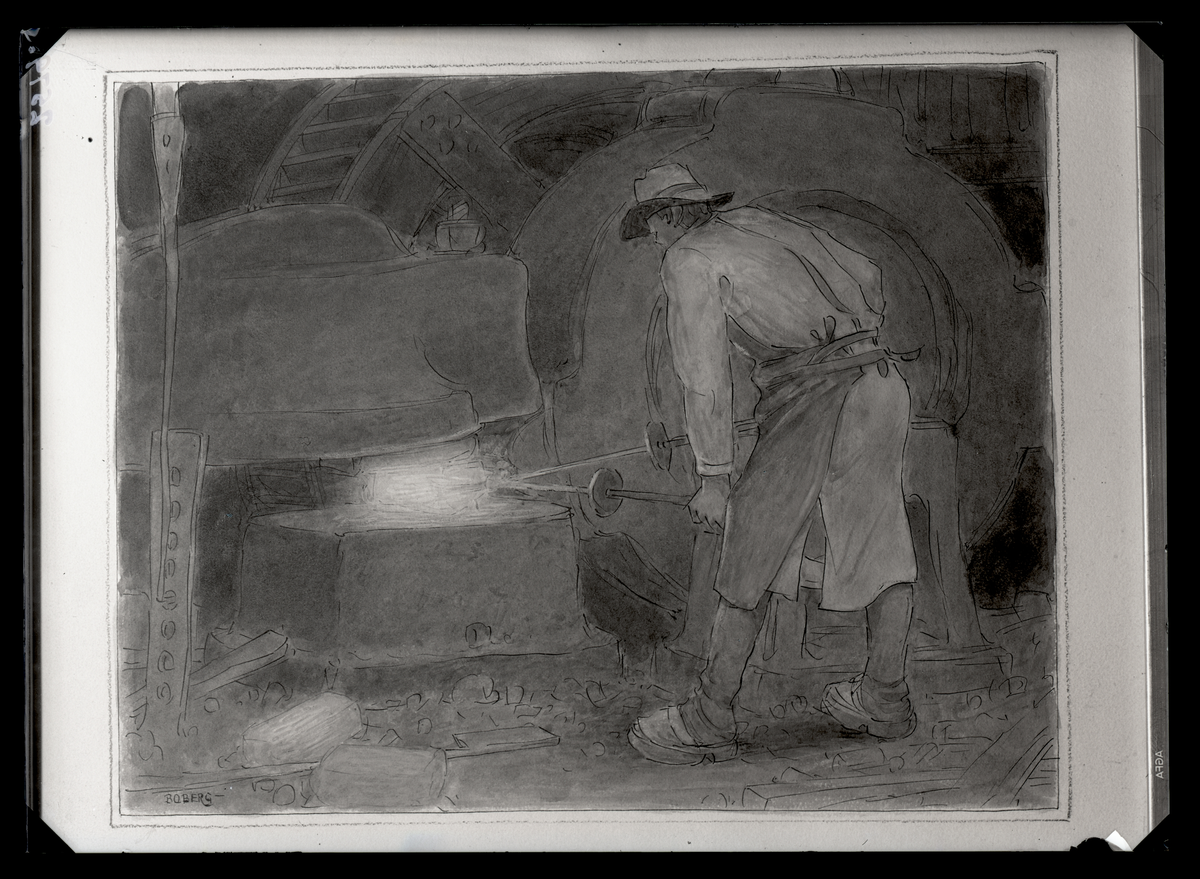 Akvarell av Ferdinand Boberg. Smältsmed avslutar smältstyckena.