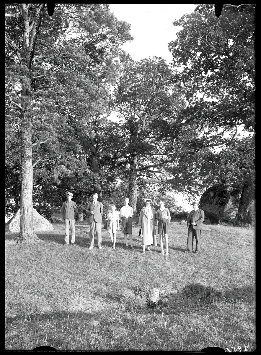 Gruppfoto, av upphittaren av stenyxan dir. Hamrin Kungsör, kand. Marita Rindgren Västerås, intendent Drakenberg. Kungs Barkarö, N. Tallholmen, Fläskskär.