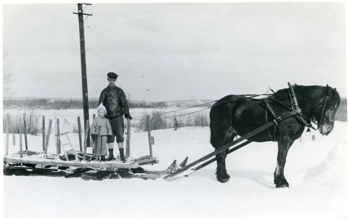Arvid Ålund med dottern Margareta samt hästsläde, 1945.