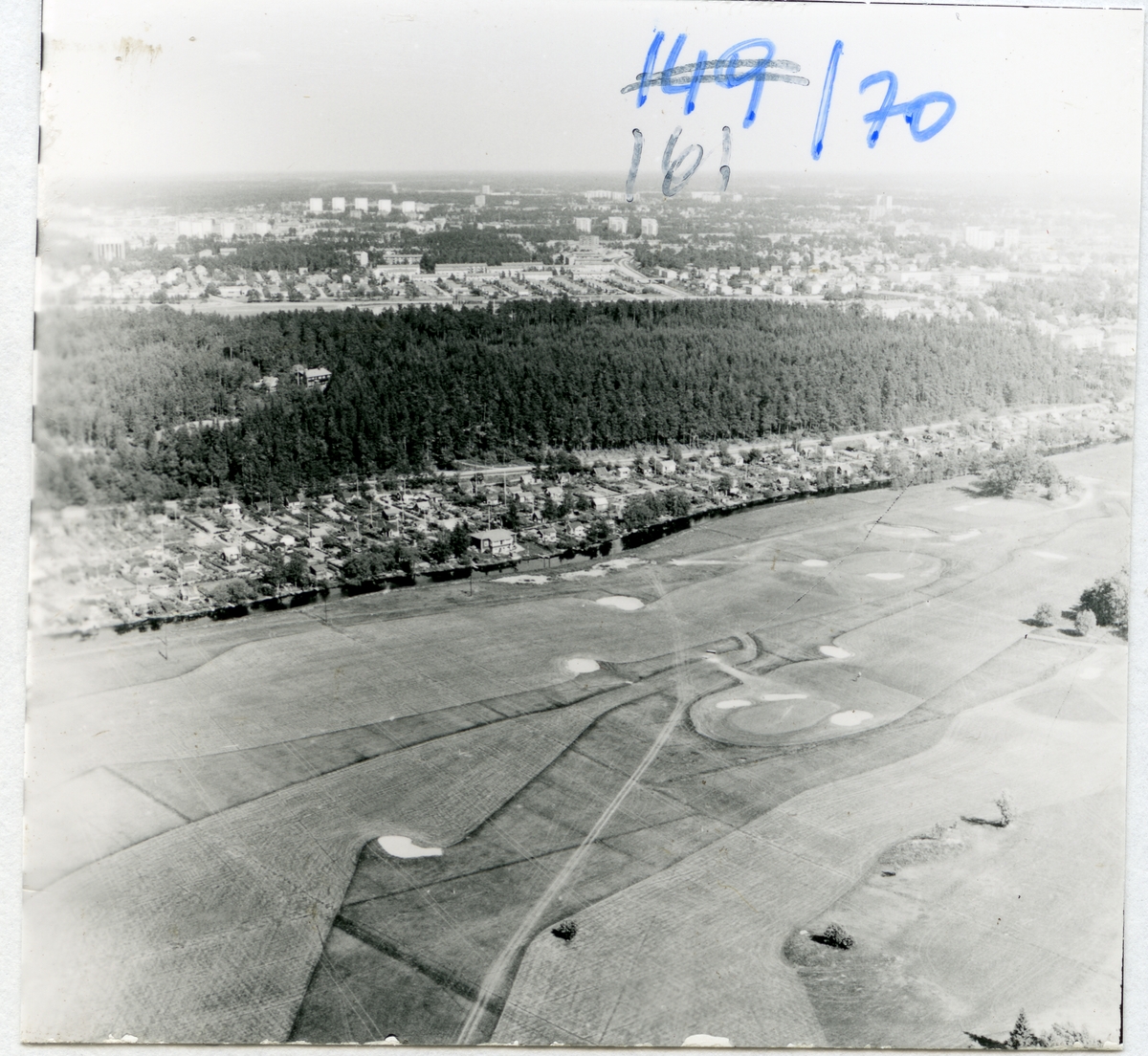 Flygfoto över koloniområde och golfbana vid Svartån.